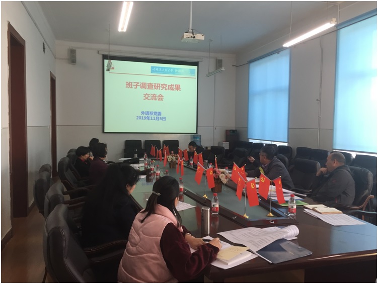 按照学校“不忘初心、牢记使命”主题教育集中学习计划安排,外语系党委于11月5日在41#417,组织召开了调查研究成果交流会。会议由分党委书记赵欣主持,班子成员全体参加,系党委委员杨剑、范莹芳、李丽、由春桥列席会议,校主题教育巡回指导组组长赵镇参会指导。