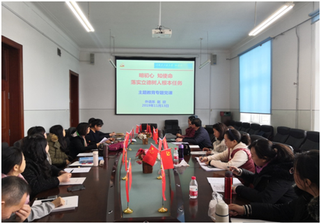 3.外语系党委副书记安沛旺为英语专业教研部党支部讲专题党课。根据院系党委“不忘初心,牢记使命”主题教育活动相关要求,英语专业教研部党支部于2019年11月14日12:30在41#417组织开展了主题党日活动。外语系党委副书记安沛旺以《践行立德树人根本任务,强化育人使命与担当》为题讲专题党课,并与党员教师探讨相关理论学习成果如何落地指导英语专业教研部具体工作。随后,支部党员在线观看了《国庆七十周年大型成就展网上展馆》和《榜样4》,思想受到深刻洗礼和巨大鼓舞,并交流了观看心得。