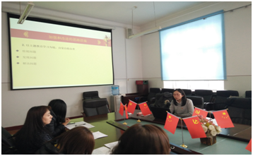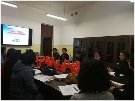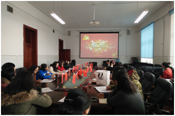 5.外语系副主任王丽丽为大学英语第一教学团队党支部、第三教学团队党支部讲专题党课。2019年11月13日12:20,按照学校“不忘初心、牢记使命”主题教育活动的要求,外语系大学英语教研部第一教学团队党支部、第三教学团队党支部在41号楼417会议室组织开展“讲专题党课”主题党日活动。第一教学团队党支部书记杨剑主持会议,支部11名党员参加会议。外语系副主任王丽丽同志以《不忘“教书育人”之初心、牢记“为党育人、为国育才”之使命》为题为参会党员讲党课,参会党员针对“育人初心”和“为党育人、为国育才”使命进行了讨论,坚定了打造“金课”的决心。最后,第一教学团队党支部组织党员集体观看国庆七十周年大型成就展网上展馆和《榜样4》,并针对祖国伟大成就和榜样的力量进行了讨论。