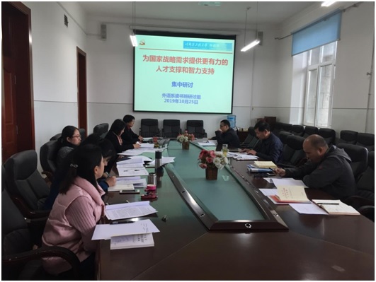 按照学校“不忘初心、牢记使命”主题教育集中学习计划安排,外语系于10月25日12:00在41#417,组织班子成员围绕为国家战略需求提供更有力的人才支撑和智力支持开展集中研讨。集中研讨由分党委书记赵欣主持,班子成员全体参加,系党委委员杨剑、范莹芳、李丽、由春桥列席研讨。