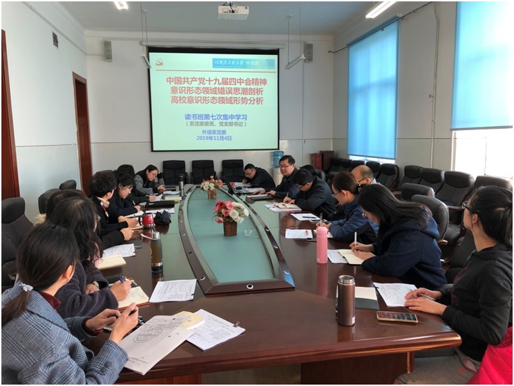 11月4日13:30,根据校党委统一部署,外语系领导班子在41#楼417组织开展了“不忘初心、牢记使命”读书班读原文学原著第七次集中学习。主要学习内容为集中学习由系党委书记赵欣主持,班子成员陈岩、安沛旺、邓晓明、王丽丽出席,外语系分党委委员及各党支部书记列席。