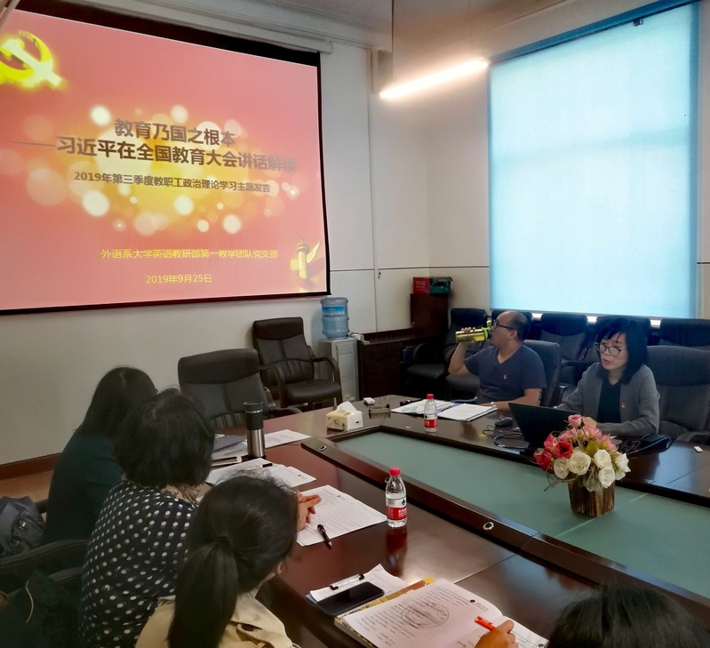 2019年9月25日上午八点,外语系大学英语教研部第一教学团队党支部在41号楼417会议室举行了2019年第三季度教职工政治理论学习暨党支部“我和我的祖国”主题党日活动。本次学习活动由党员张迎新主持,全体教职工参加,外语系主任陈岩全程参会并做指导讲话。