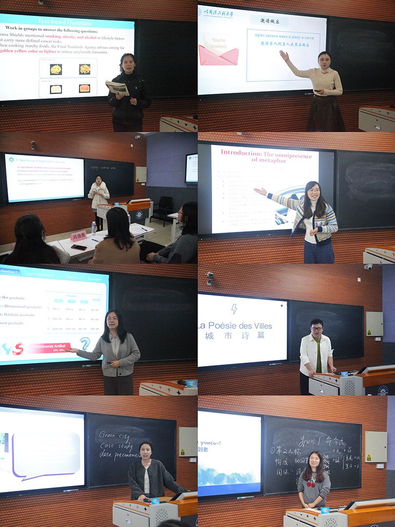 按照青年教师教学竞赛流程和方案,每位参赛教师精心设计教学方案,依次进行10分钟课堂教学展示。展示过程中,各位教师充分结合外语学科特色,以1个学时(45分钟)为单位的教学设计为基础,通过生动的语言表达、精心设计的教学环节、灵活运用的智慧教学工具,将学情分析、教学目标、重点难点突破等内容融入课堂实践,部分教师还创新采用情境教学、跨文化对比、小组互动等教学方法,有效调动 “课堂氛围”,展现出鲜明的教学风格与先进的教育理念。