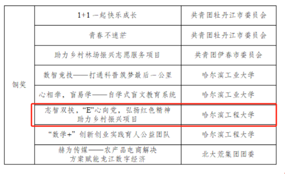 近日,由团黑龙江省委、省青年志愿者协会举办的第六届黑龙江省青年志愿服务公益创业赛决赛落下帷幕,我院团委参赛项目“志智双扶,‘E’心向党,弘扬红色精神助力乡村振兴”喜获铜奖,代表我院首次参与该项竞赛并获奖,且我校仅有两支队伍进入省赛决赛,取得佳绩!