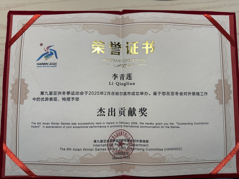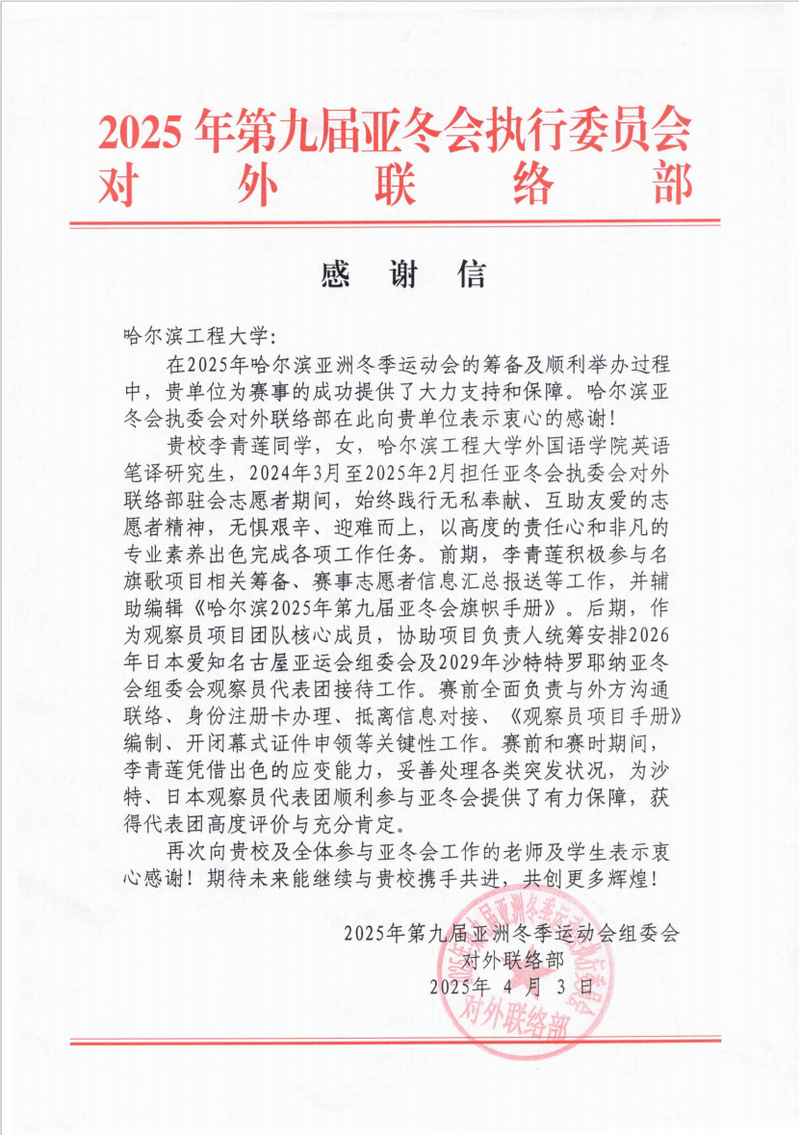 近日,第九届亚冬会执委会对外联络部向我校致感谢信,信中对我校在亚冬会期间给予的大力支持表示诚挚感谢,并特别表扬了我校太阳成集团tyc9728英语笔译专业2022级硕士研究生李青莲担任亚冬会志愿者期间的出色表现。