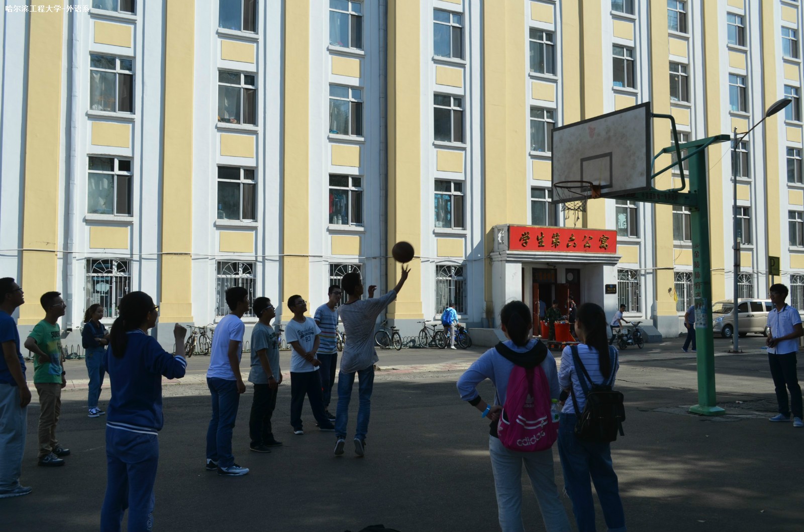 9月16日中午12点50分,由外语系学生会体育部举办的“旋转后定点投篮”比赛在六公寓前篮球场举行。外语系大一大二全体参加了此次活动。