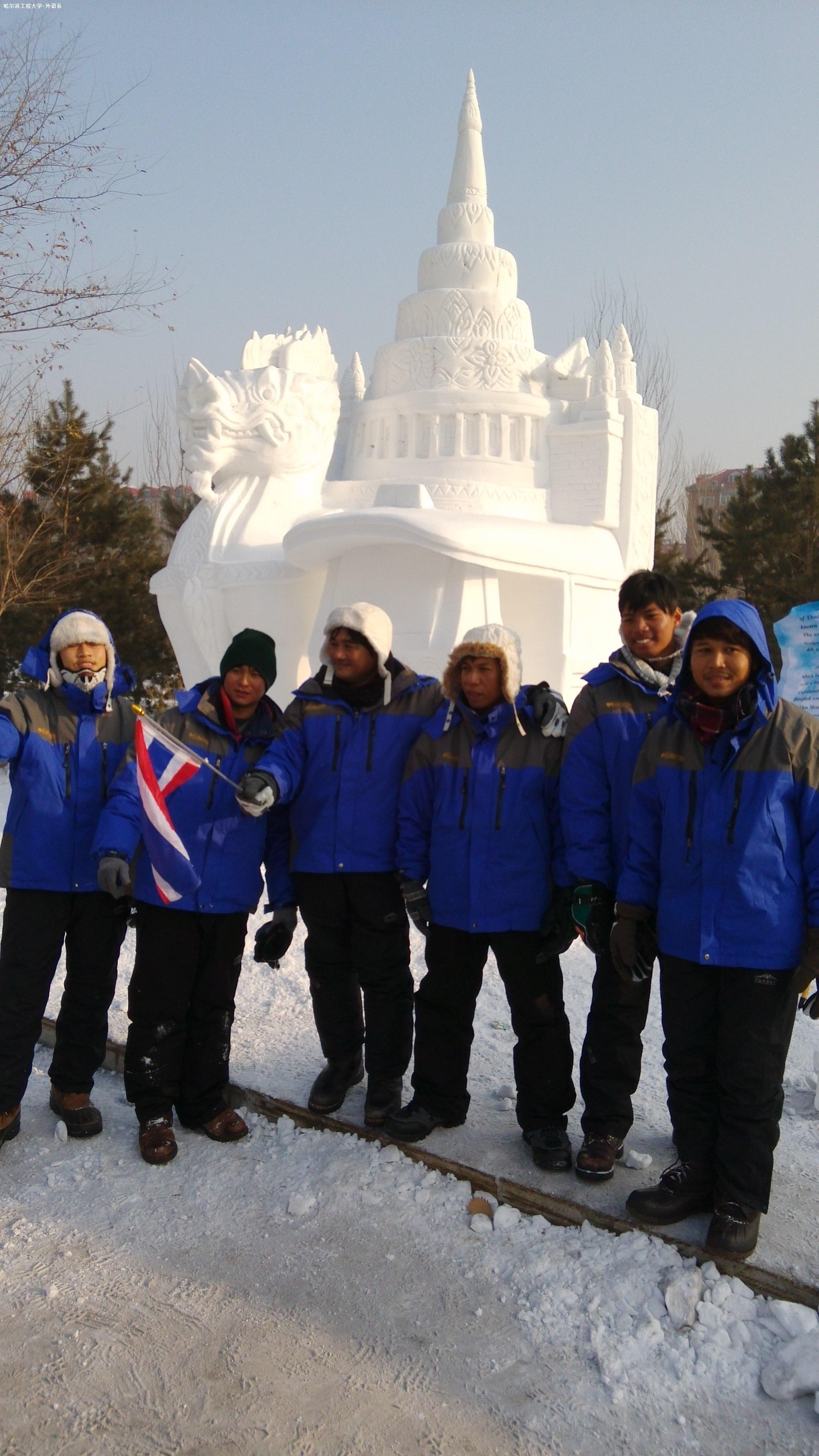 看哪,那儿有一帅哥!正在泰国朋友的雕像前合影呢!还有这边,萌妹子们手挽手,肩并肩,围在咱们学院作品旁合影留念呢!对面,一对情侣正亲密地半拥着,似乎是在一起欣赏面前的这个大雪雕吧,好生让人羡慕呦!