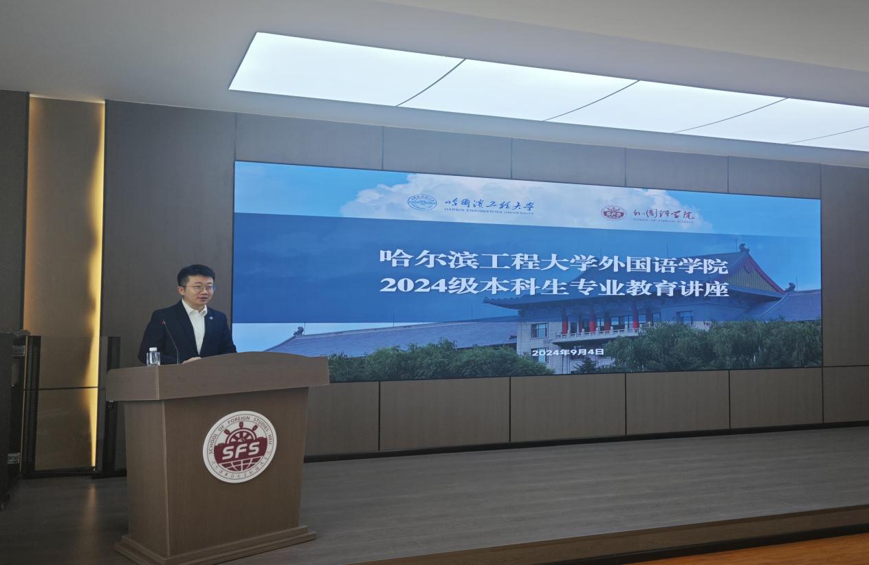院长助理、本科英语专业教研部主任朱戈勋进行专业教育讲座。他向大家详细解读了2024版本科人才培养方案的设计思路、平台类别、课程逻辑,以及此版方案的特色和创新点。同时,他简要分享了自己的求学经历,并向同学们提出两点要求,一是要先学做人做事,再做学问,认真对待自己承担的每一项任务;二是要以自我提升为导向,而非结果为导向,在利益与诱惑面前坚守自己的初心。最后他基于大学各阶段学习特点,给予了相应建议。