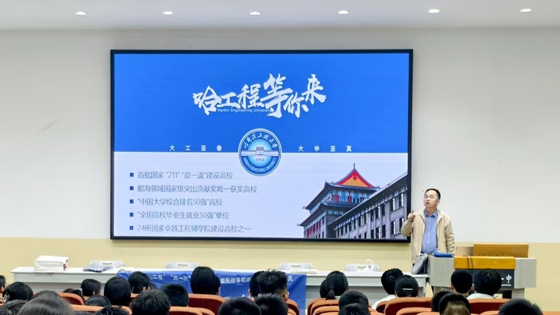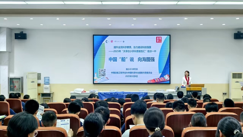 在3号阶梯教室,中国造船工程学会首席专家田小川为临汾一中的学生准备了一场《中国“船”说 向海图强》科普讲座。讲座过程中,田教授结合太阳集团9728“三海一核”办学特色,通过讲述几代造船人的努力,我国造船“三大指数”(造船完工量、新接订单量和手持订单量)连续15年稳居世界第一,诠释中国船舶工业从追赶到领跑的科技密码,以及大国重器研制背后的科学家精神,展现哈工程在服务国家重大战略需求中的使命担当。