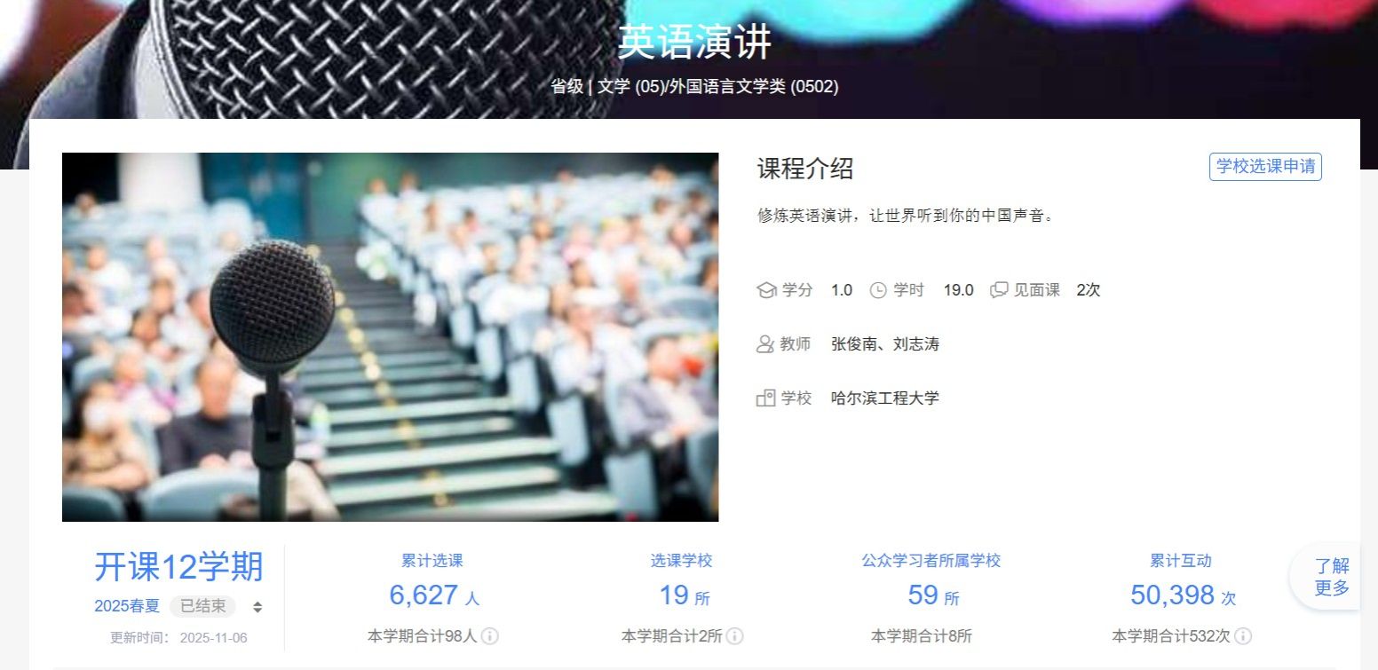 《英语演讲》课程的建设历程体现了持续创新、追求卓越的专业精神。课程于2020年9月在智慧树平台首次上线,开启了线上教学的全新探索。经过七个学期的完整运行和持续优化,课程于2023年10月获评黑龙江省线上一流课程,这一阶段性成果为后续发展奠定了坚实基础。在获得省级认定的基础上,课程团队继续深化建设,不断完善课程内容和教学方式。课程负责人张俊南带领团队对教学内容进行精细化打磨,优化课程结构,丰富教学资源。经过两年精心打磨,课程最终在2025年成功跻身国家级一流课程行列,完成了从平台上线到国家级"金课"的跨越式发展。