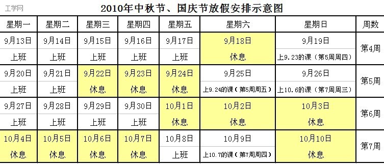 根据国务院办公厅有关通知精神,现将学校2010年中秋节、国庆节放假安排通知如下(见安排示意图):