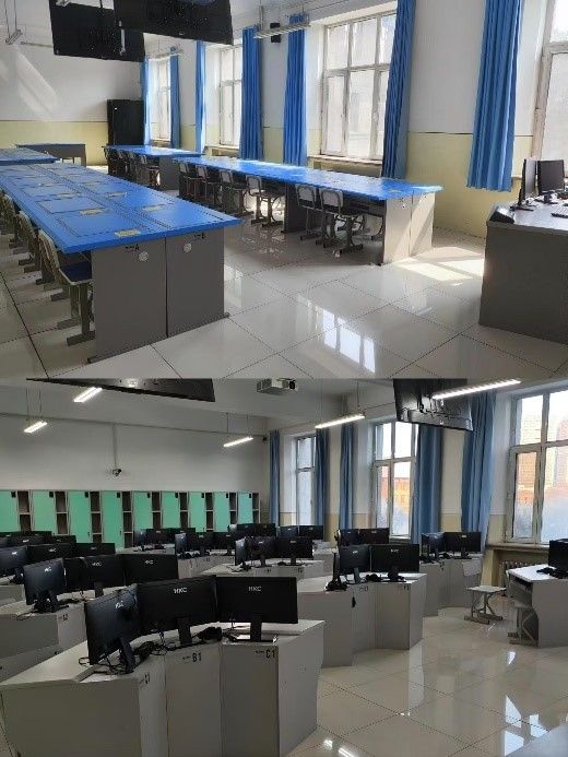云终端教室6间,有多种学生桌——蝴蝶型、研讨型,每间42座,便于师生交互与学生分组讨论,三人讨论、多人讨论,在实现基础教学功能的同时,还可实现网络化教学、自主学习、师生互动教学、网络化考试及评测等功能,用于外语口译翻译考试,外语学科项目研究,满足考研学一体化人才培养需求。